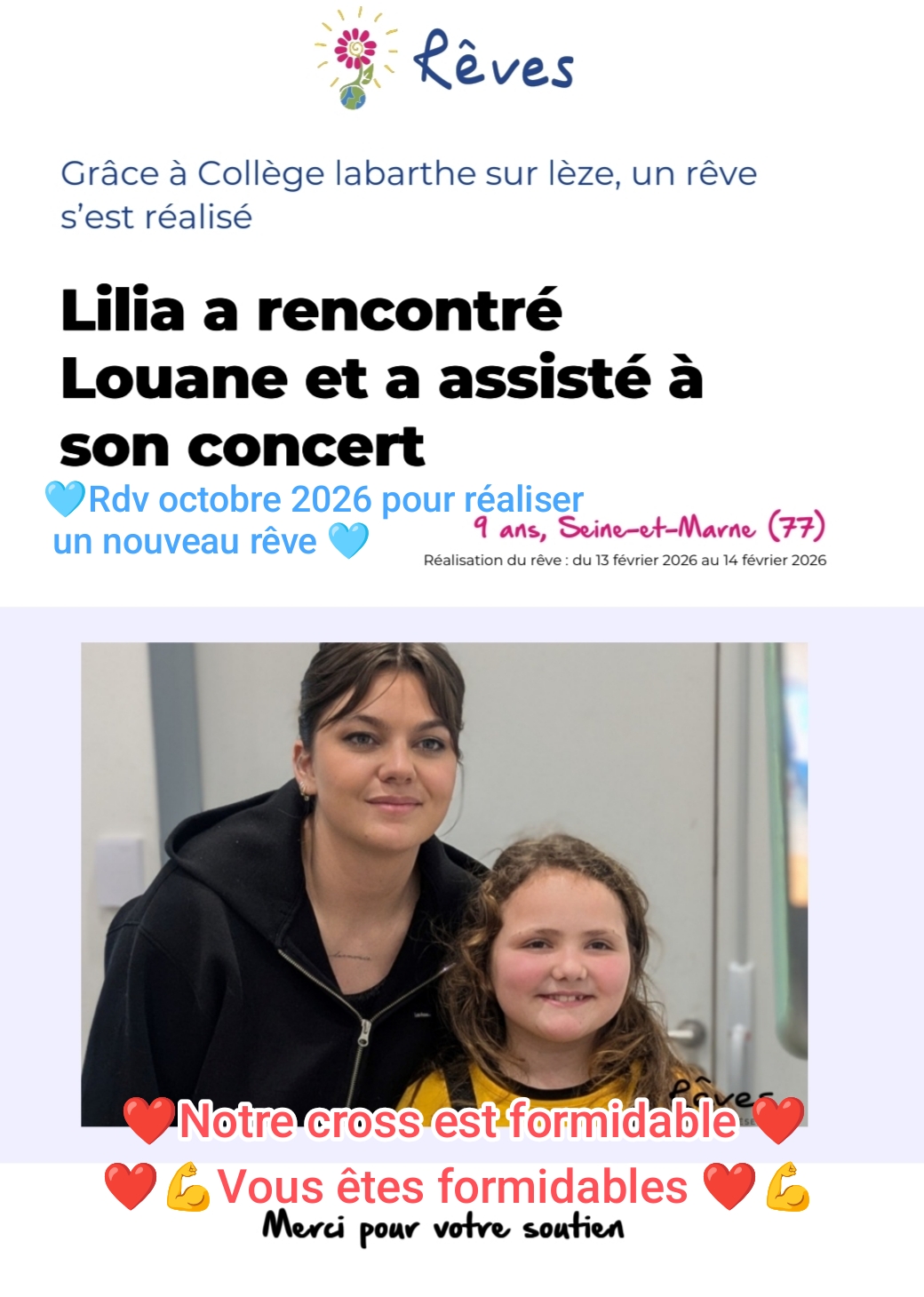 Grâce à votre mobilisation et à votre générosité lors de notre cross solidaire, le rêve de Lilia a pu être exaucé les 13 et 14 février 2026.